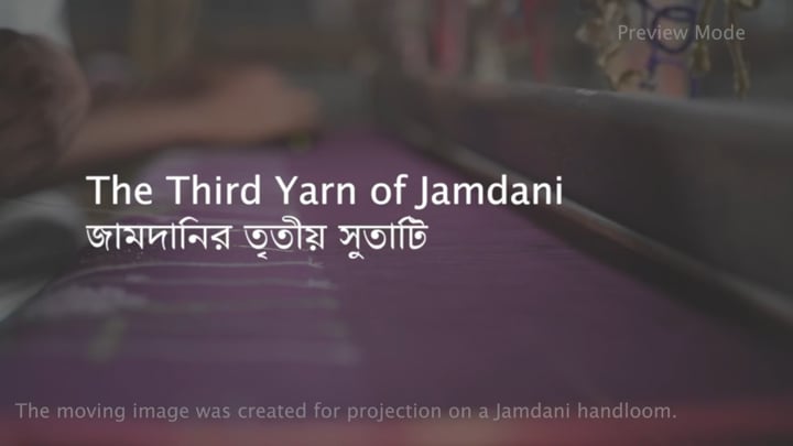 This moving image installation weaves together the tactile poetry of the handloom, where artisans from Demra meticulously interlace the third yarn with vertical and horizontal threads, counting and crafting motifs that breathe life into Dhakai Jamdani. As the hands move—counting, contemplating, conversing—the act of weaving becomes a dialogue between tradition and memory, echoing the lost elegance of Dhakai Muslin.